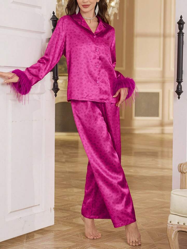 CM-LS405337 Women Trendy Seoul Style Leopard Print Faux Fur Decor Satin Pajama Set - Hot Pink