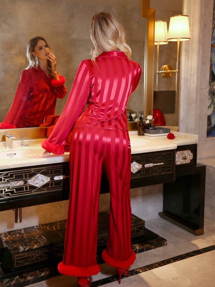 CM-LS845048 Women Trendy Seoul Style Feather Jacquard Stripe Pattern Satin Pajama Set - Burgundy