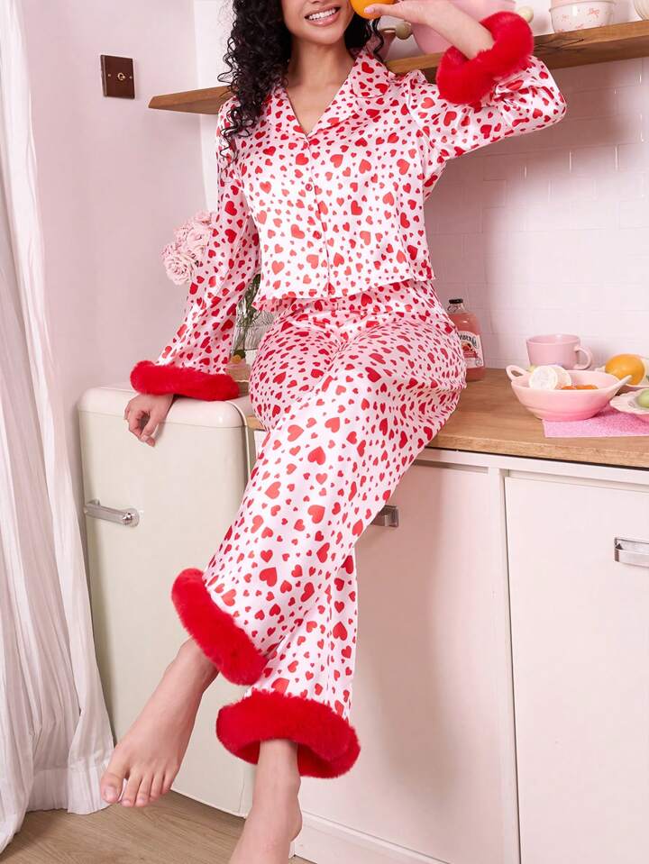 CM-LS938888 Women Trendy Seoul Style V-Neck Pastel Embossed Heart And Feather Pajama Set