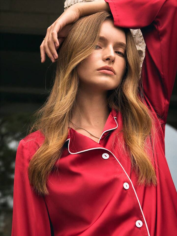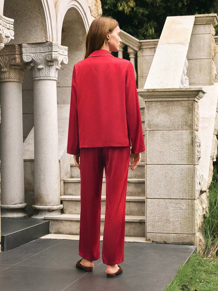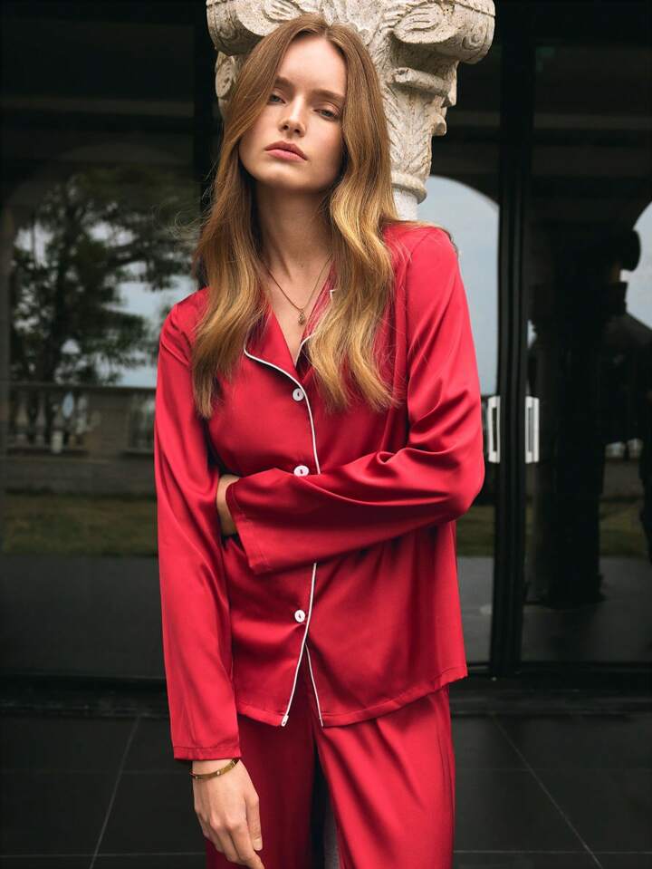 CM-LS953056 Women Trendy Seoul Style Solid Color Front Button Long Sleeve Pajamas Set - Red