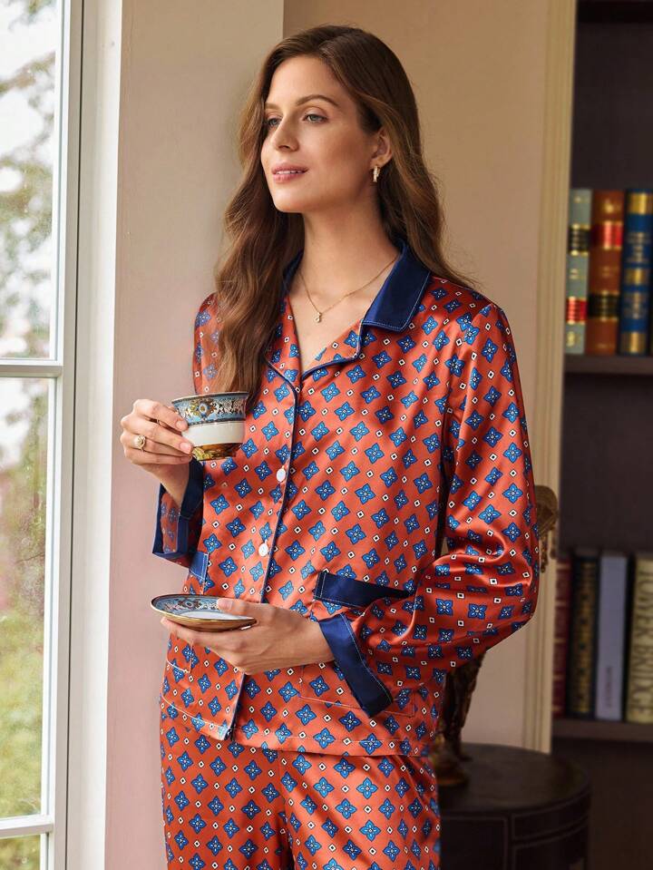 CM-LS989249 Women Trendy Seoul Style Faux Silk Colorblock Geometric Pattern Fuzzy Cuff Pajama Set
