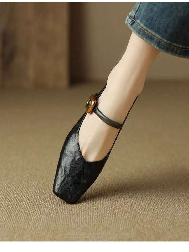 CM-SHS207666 Women Trendy Seoul Style Solid Color Buckle Detail PU Leather Slip-On Flat Shoes - Black
