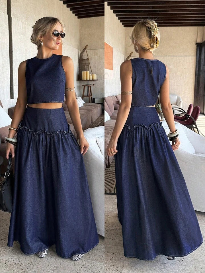 CM-SS155777 Women Casual Seoul Style Dark Wash Sleeveless Denim Vest Top With Flared Long Skirt - Set
