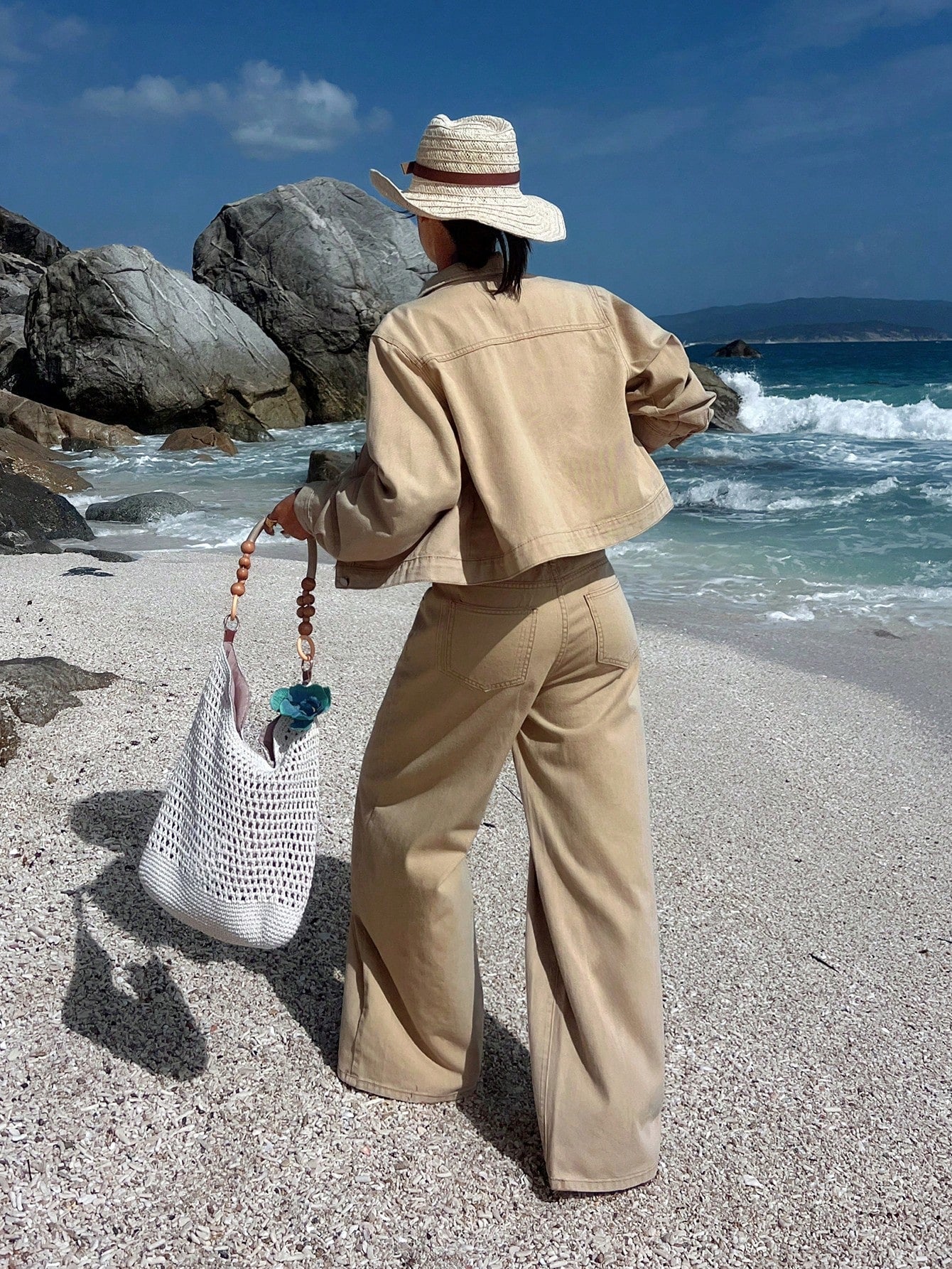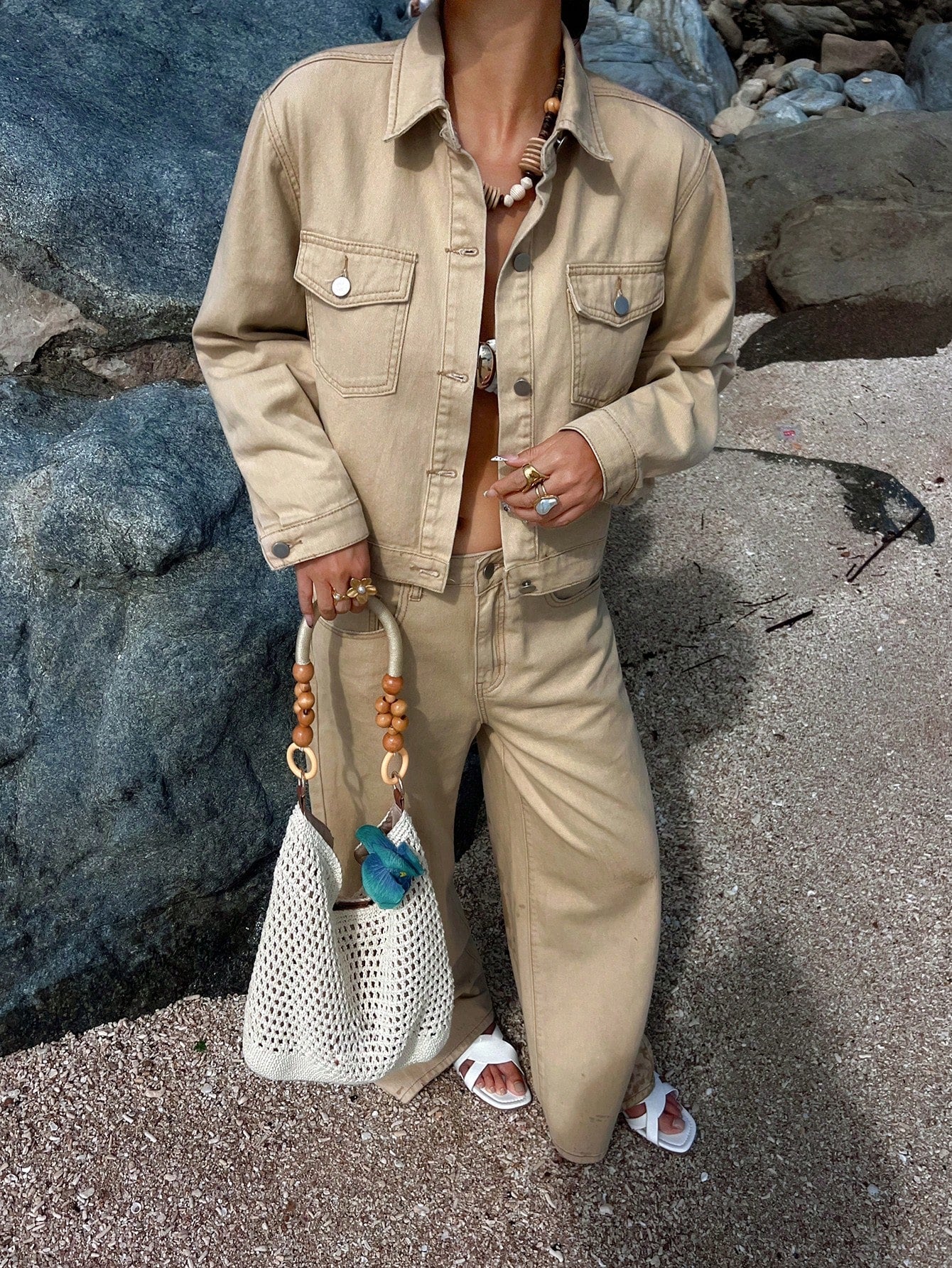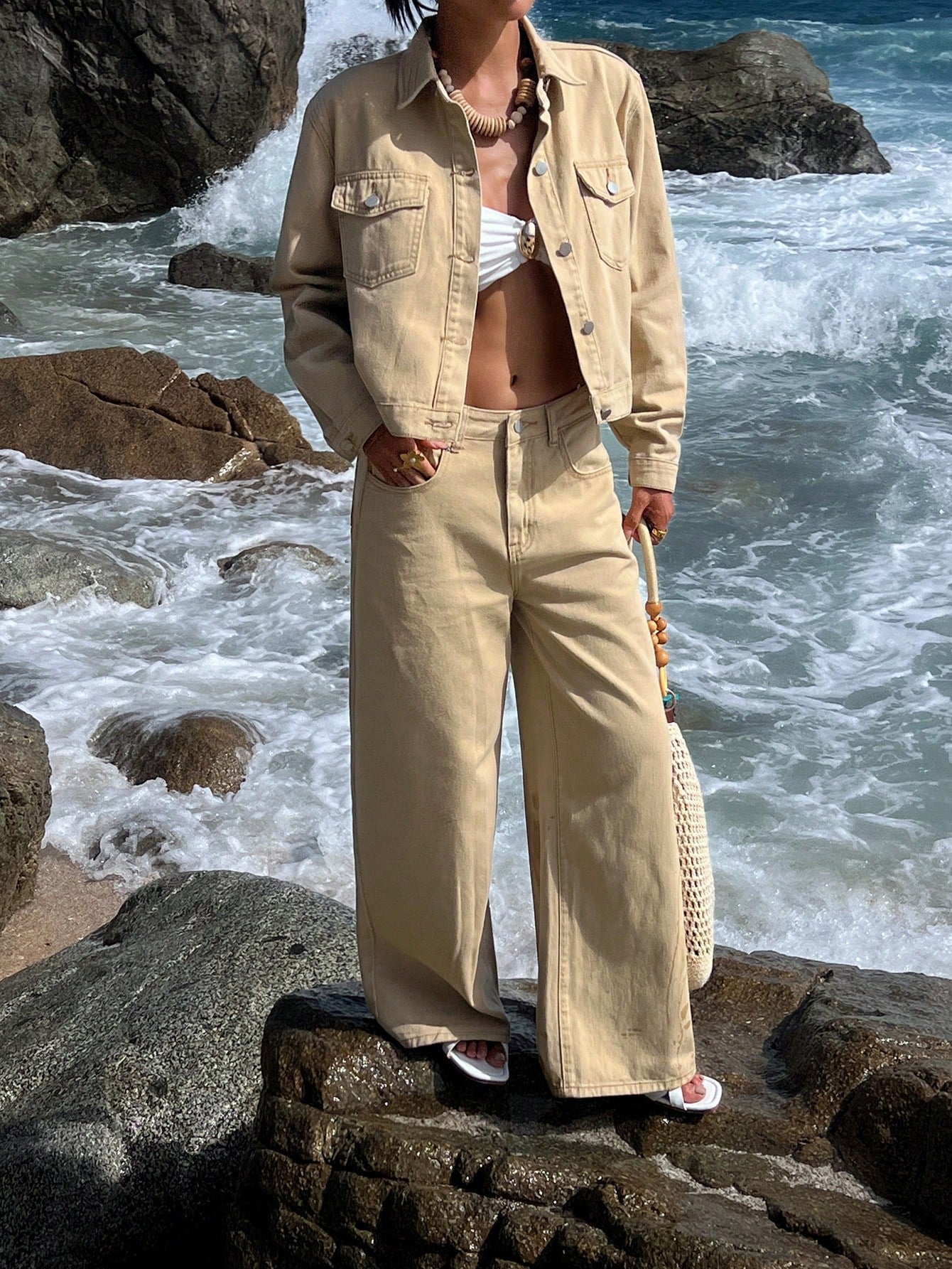 CM-SS192942 Women Casual Seoul Style Collar Neckline Long Sleeve Pocket Jacket With Wide Leg Jeans - Set
