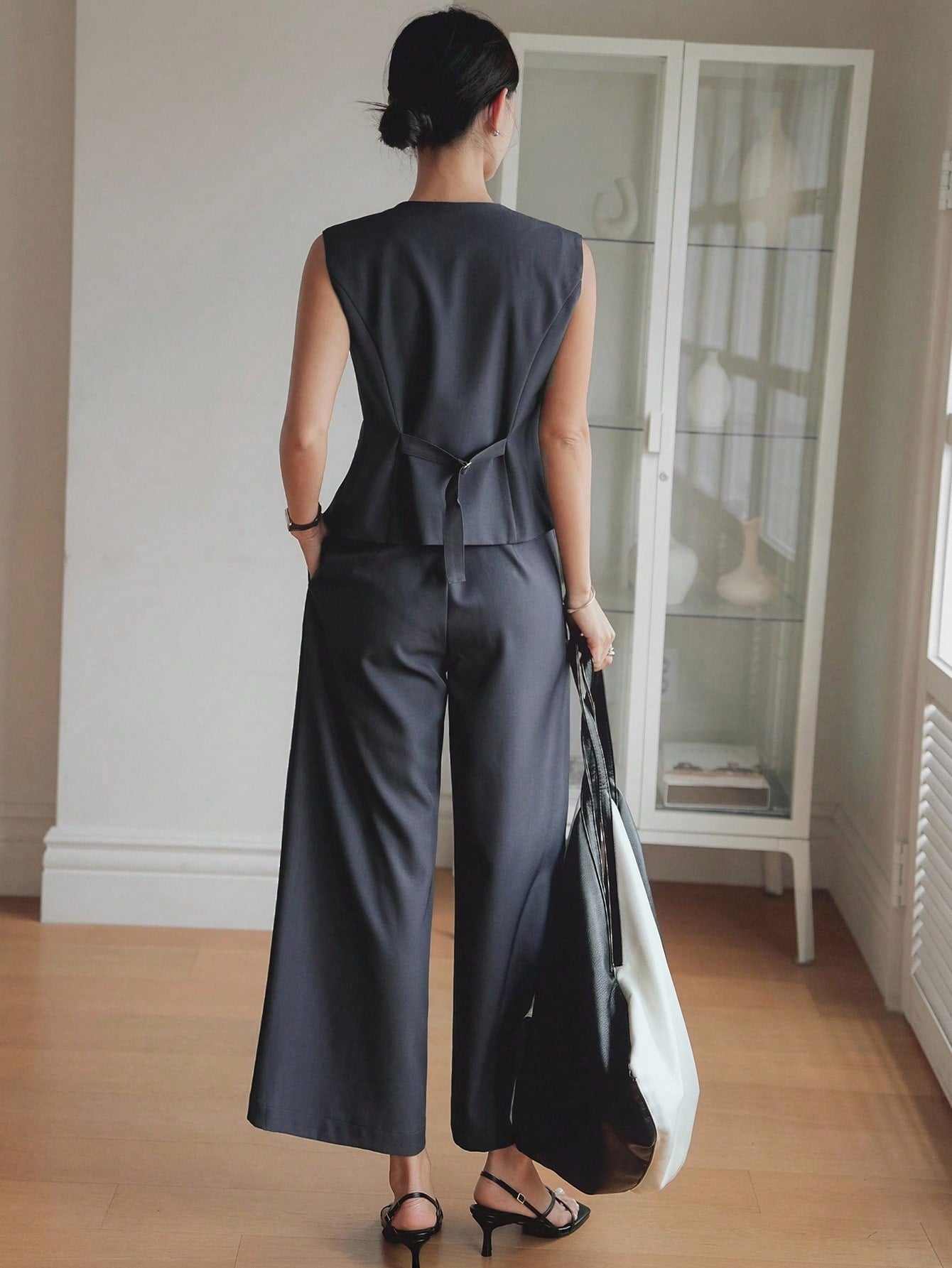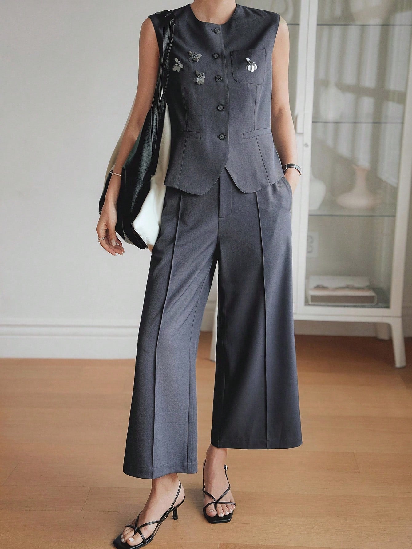 CM-SS243577 Women Elegant Seoul Style Round Neck Sequin And Beaded Decor Vest With Straight Leg Pants - Set