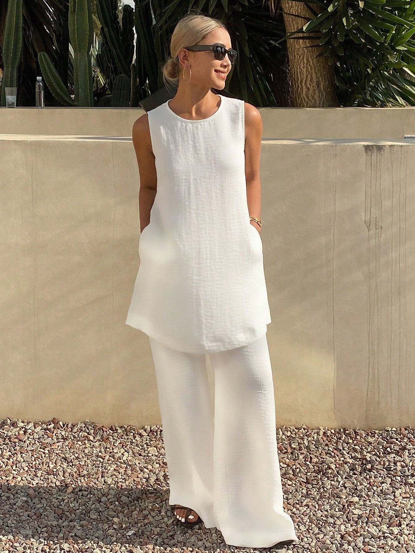 CM-SS250303 Women Trendy Bohemian Style Solid Color Round Neck Sleeveless Long Tank Top With Wide Leg Pants - Set