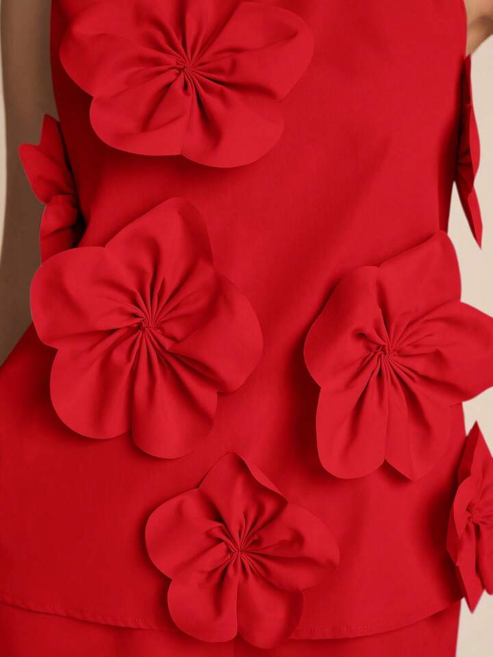 CM-SS257117 Women Elegant Seoul Style Stand Colllar Sleeveless 3D Floral Decor Top With Wide Leg Pants - Set
