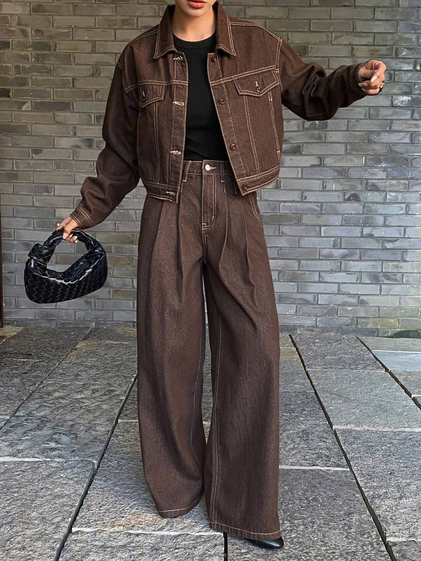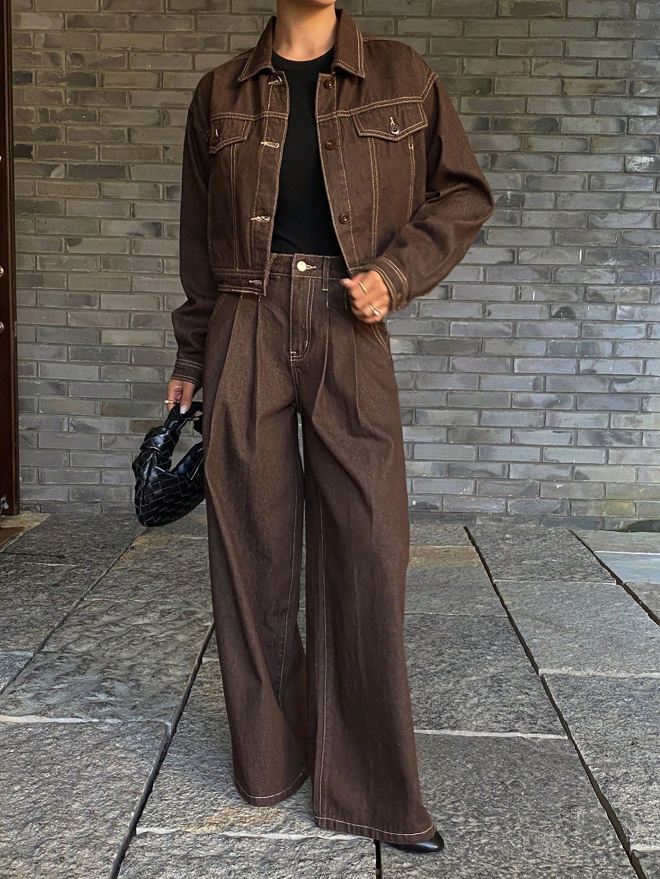 CM-SS260020 Women Casual Seoul Style Color Blocking Faux Pocket Jacket With Wide Leg Jeans - Set