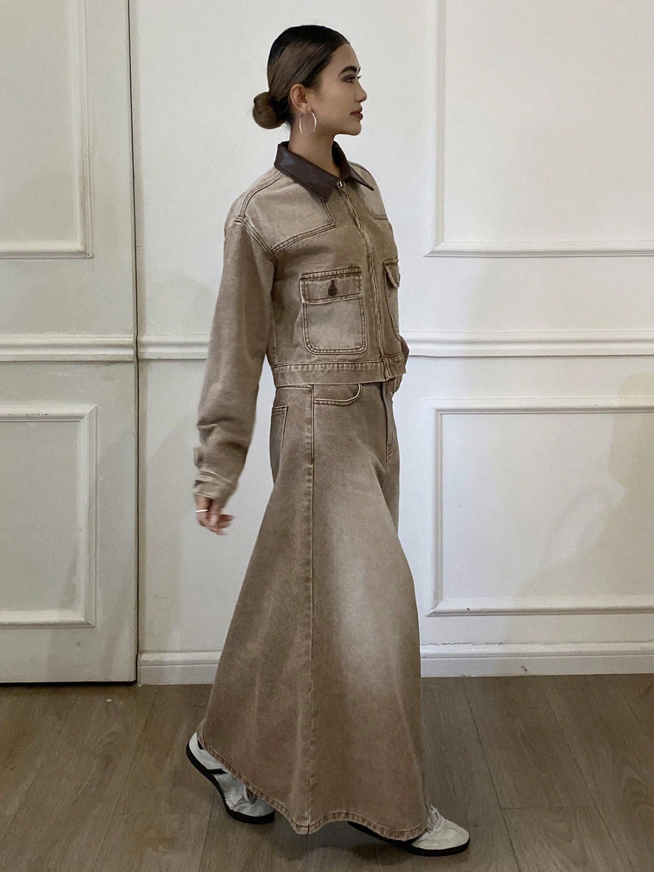 CM-SS424477 Women Casual Seoul Style PU Collar Splice Loose Long Sleeve Denim Jacket With Skirt - Set