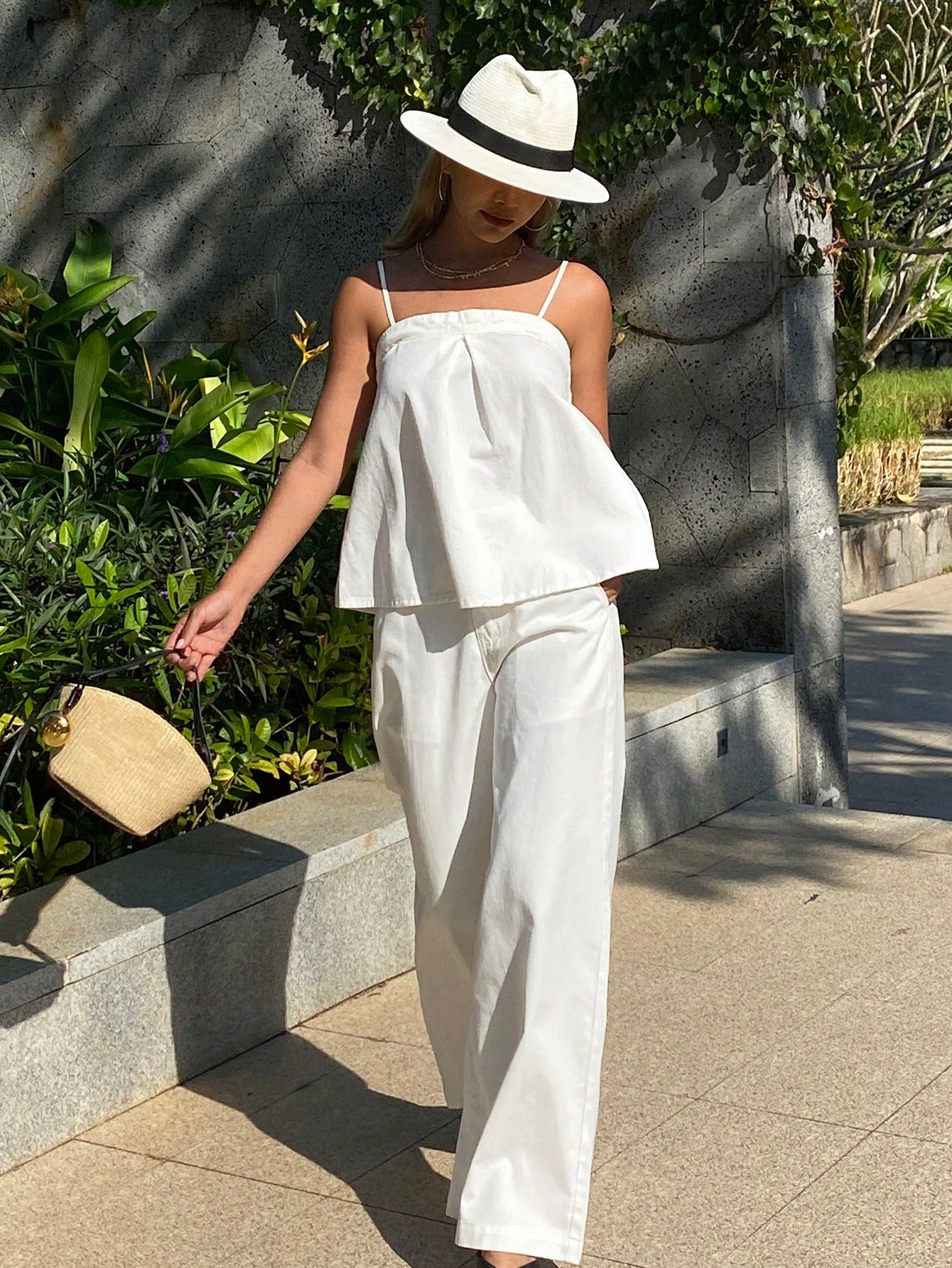 CM-SS670477 Women Casual Seoul Style Pleated Camisole Denim Top With Loose Straight Leg Pants - Set