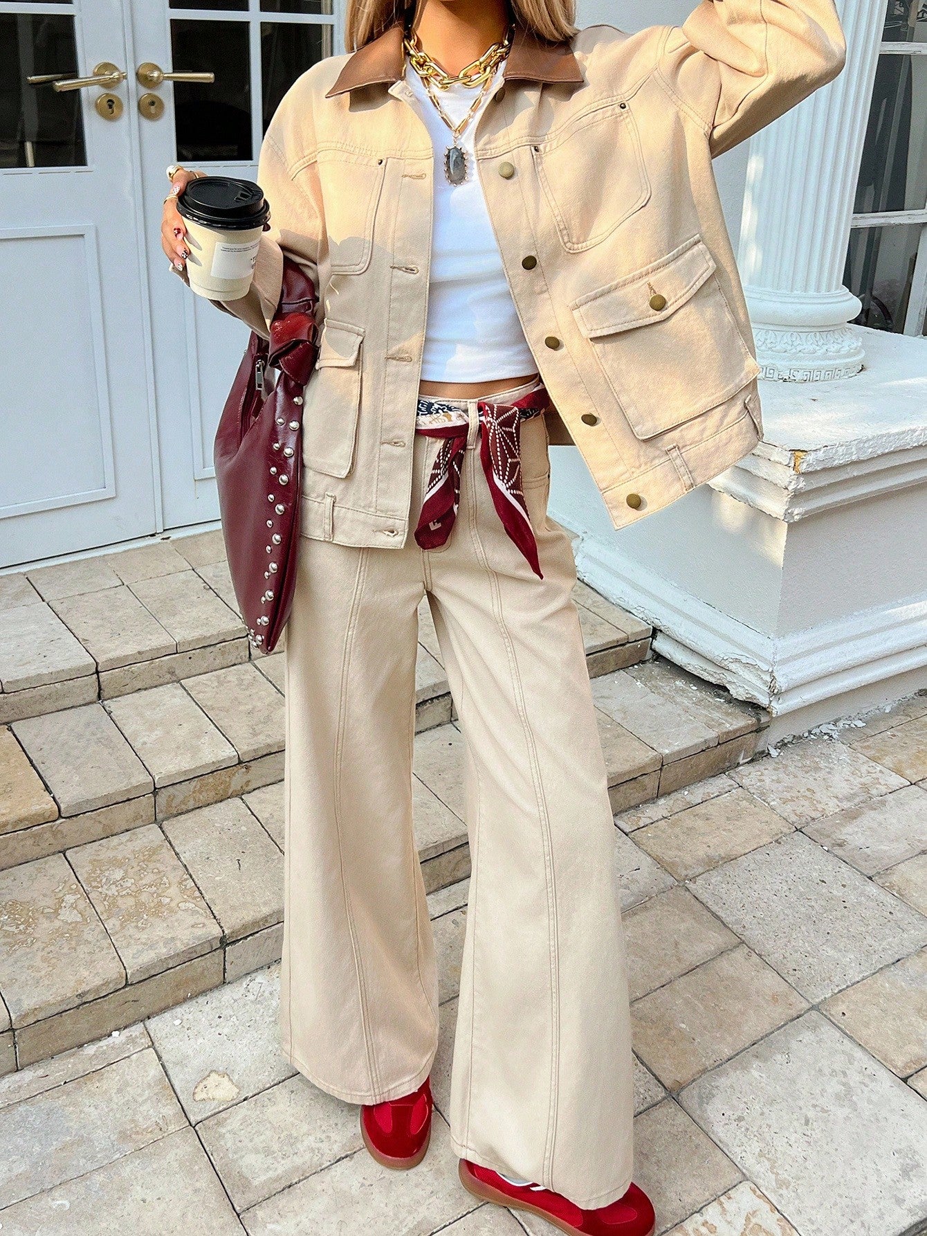 CM-SS802707 Women Casual Seoul Style Contrast Color Collar Decorated Denim Jacket With Straight Leg Pants - Set