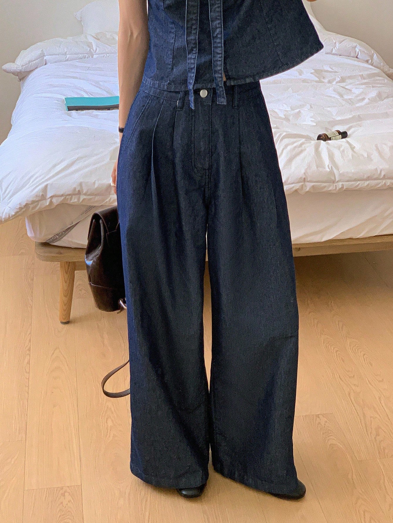 CM-SS828998 Women Casual Seoul Style Round Neck Tie Front Short Sleeve Denim Shirt With Straight Leg Jeans - Set