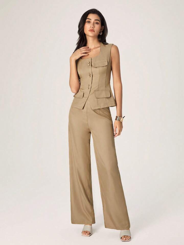 CM-SS846945 Women Elegant Seoul Style Solid Color Single-Breasted Square Collar Vest With Pants - Rust Brown