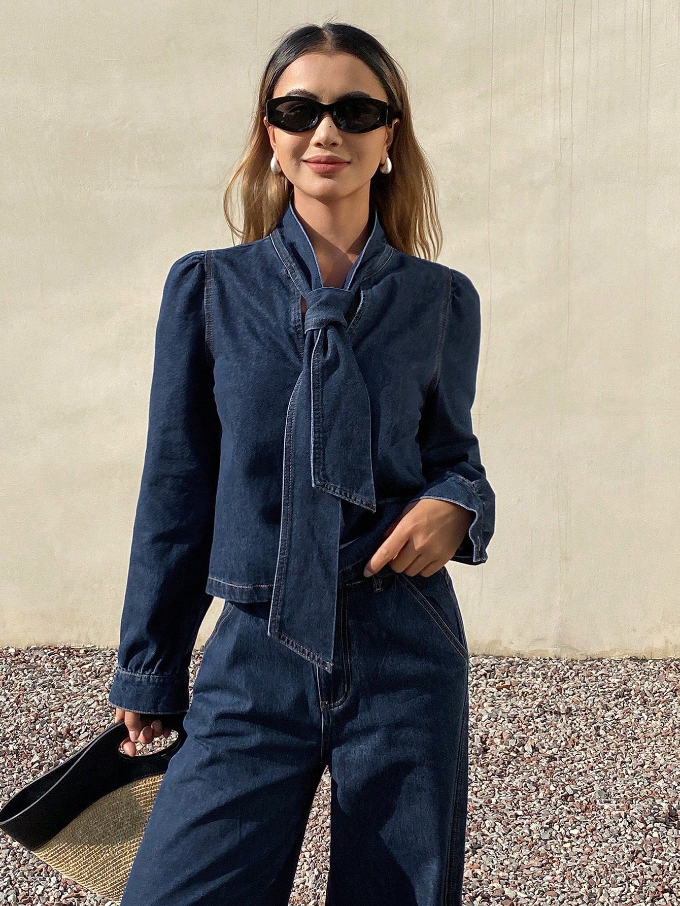 CM-SS911796 Women Elegant Seoul Style Bow Tie Design Long Sleeve Top With Wide Leg Jeans - Set