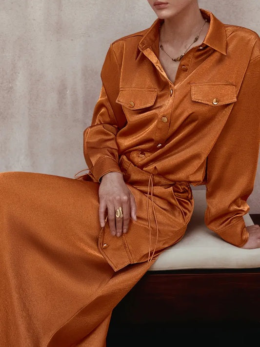 CM-ST351276 Women Elegant Seoul Style Solid Color Front Button Long Sleeve Drawstring Top With Maxi Skirt - Set