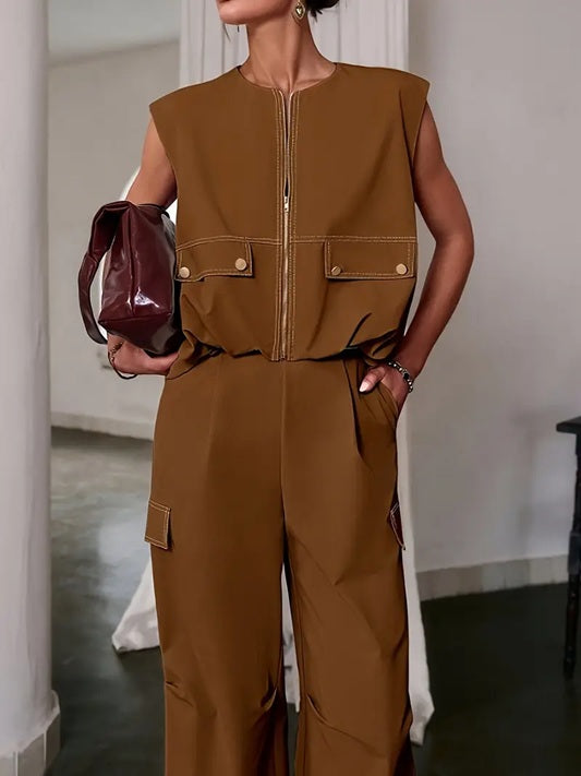 CM-ST460904 Women Elegant Seoul Style Solid Color Sleeveless V-Neck Button Details Drawstring Vest With Pants - Set