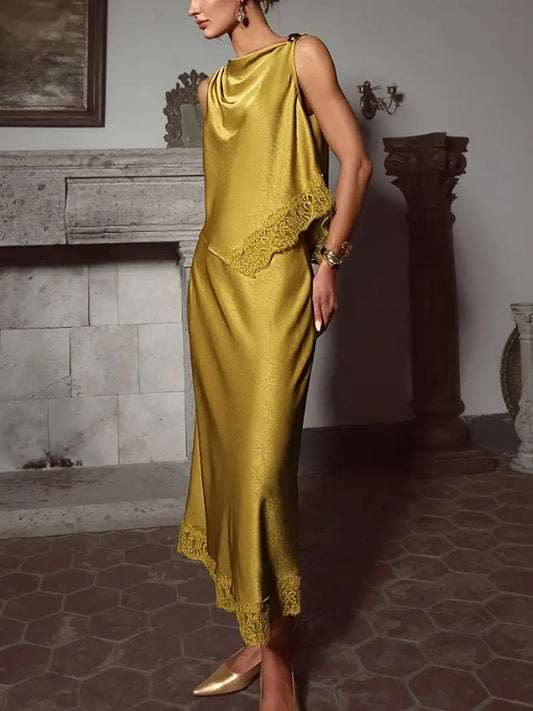 CM-ST461995 Women Elegant Seoul Style Solid Color Glossy Contrast Lace Splicing Vest With Long Skirt - Set