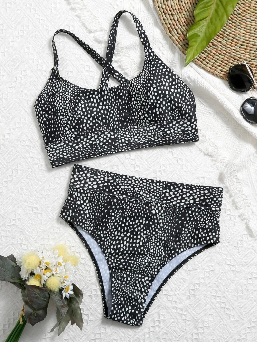 CM-SWS518981 Women Trendy Seoul Style Dalmatian Crisscross High Waisted Bikini Swimsuit - Black