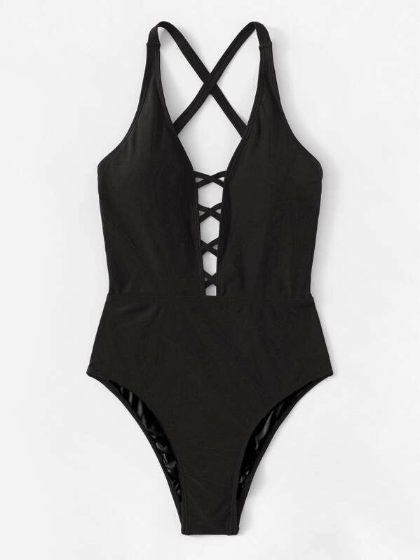 CM-SWS625801 Women Trendy Seoul Style Criss Cross Ruched Backless One Piece Swimsuit - Black