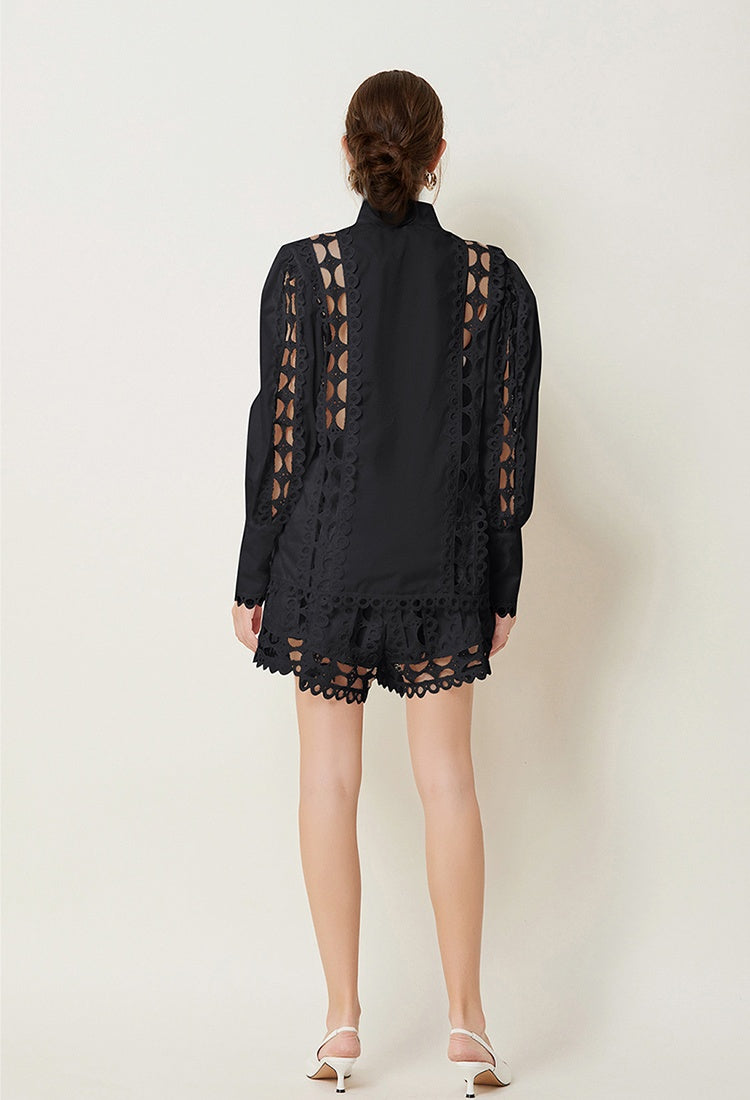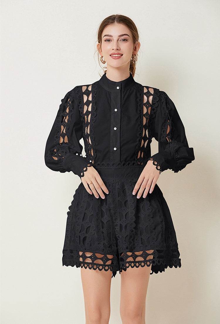 CM-SY026365 Women Elegant European Style Hollow Out Long Sleeve Top With High Waist Shorts - Set (Available in 2 colors)
