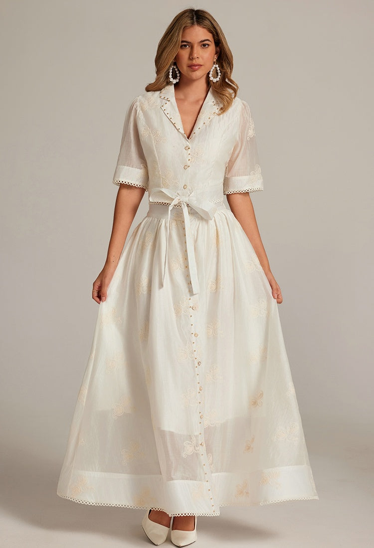 CM-SY035589 Women Elegant European Style Collar Neckline Half Sleeve Beads Decor Blouse With High Waist Long Skirt - Set