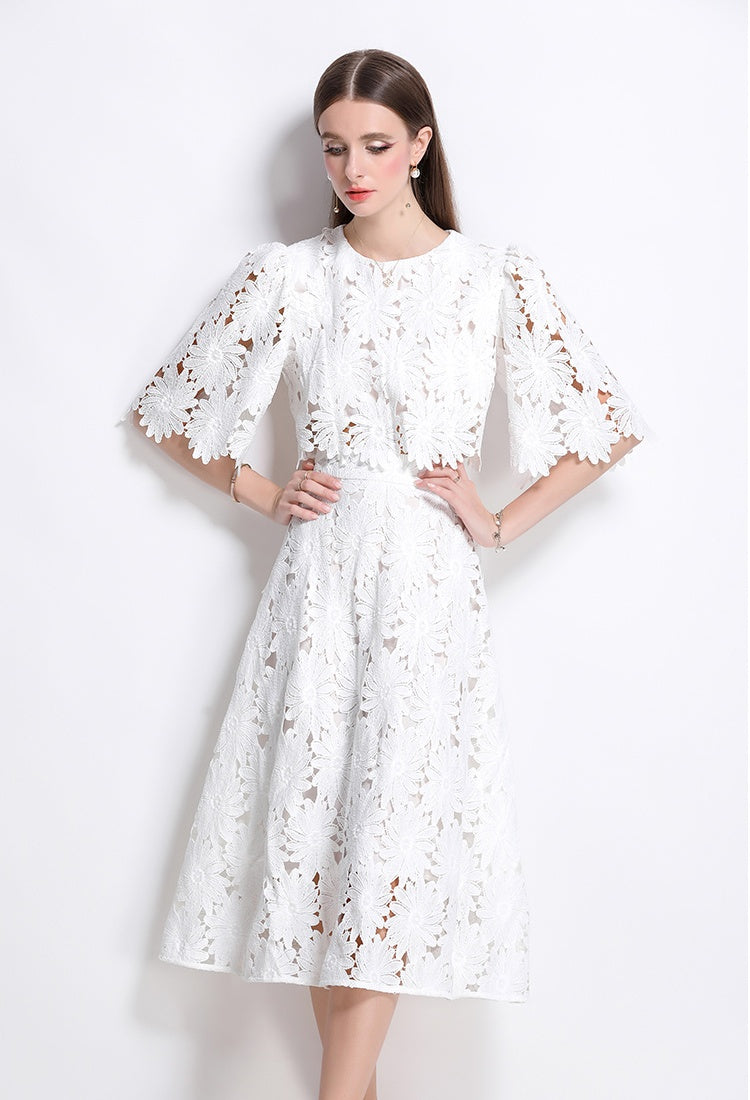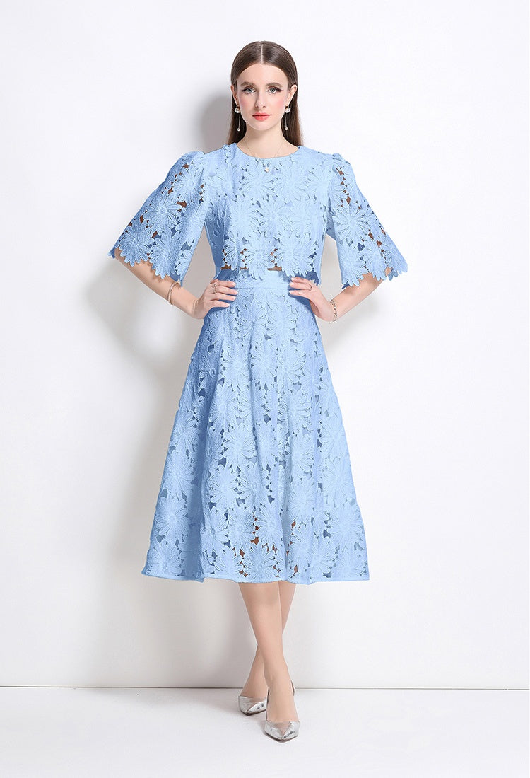 CM-SY041083 Women Elegant European Style Embroidered Round Neck Half Sleeve Blouse With High Waist Skirt - Set (Available in 3 colors)