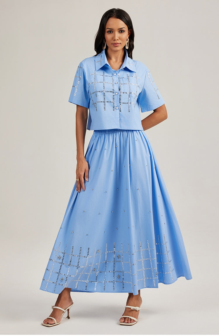 CM-SY044424 Women Elegant European Style Lapel Neckline Short Sleeve Shirt With Long Skirt - Set