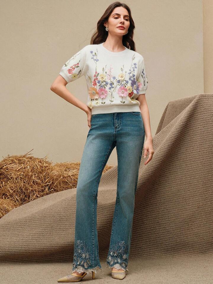 CM-TS133436 Women Casual Seoul Style Beaded Embroidered Floral Round Neck Short Sleeve Knit Top - White