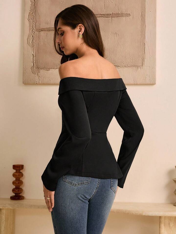 CM-TS137444 Women Elegant Seoul Style Solid Color Off Shoulder Cinched Waist Long Sleeve Blouse - Black