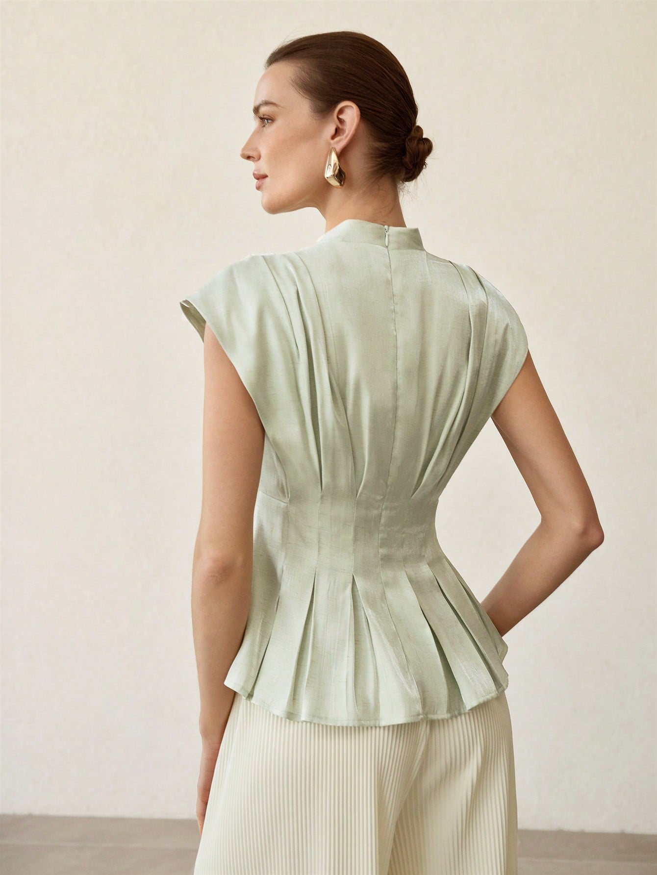 CM-TS148037 Women Elegant Seoul Style V-Neck Sleeveless Cinched Waist Faux Linen Top - Green