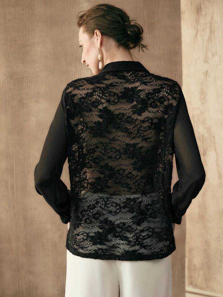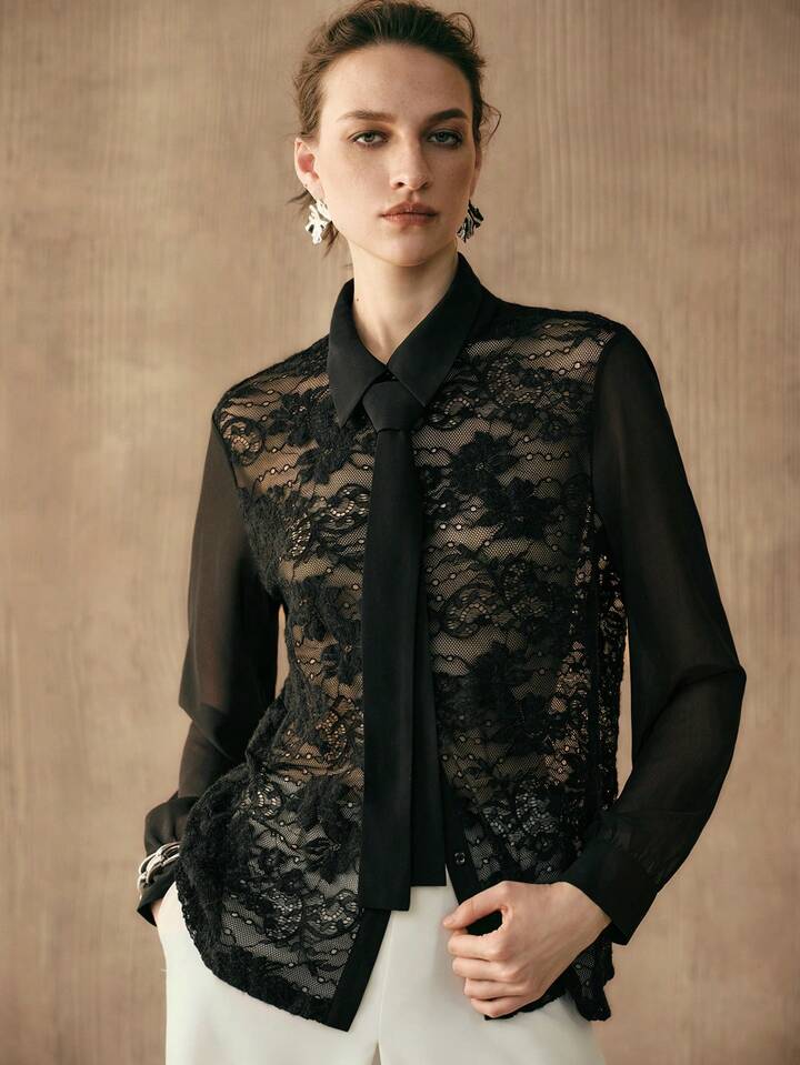 CM-TS151154 Women Elegant Seoul Style Lace Splice Ribbon Design Long Sleeve See Through Blouse - Black