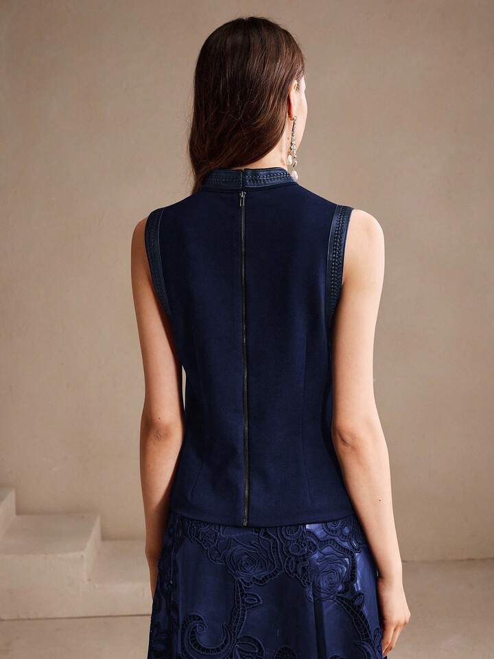 CM-TS246983 Women Elegant Seoul Style Stand Collar Rhinestone Decor Sleeveless Tank Top - Navy Blue