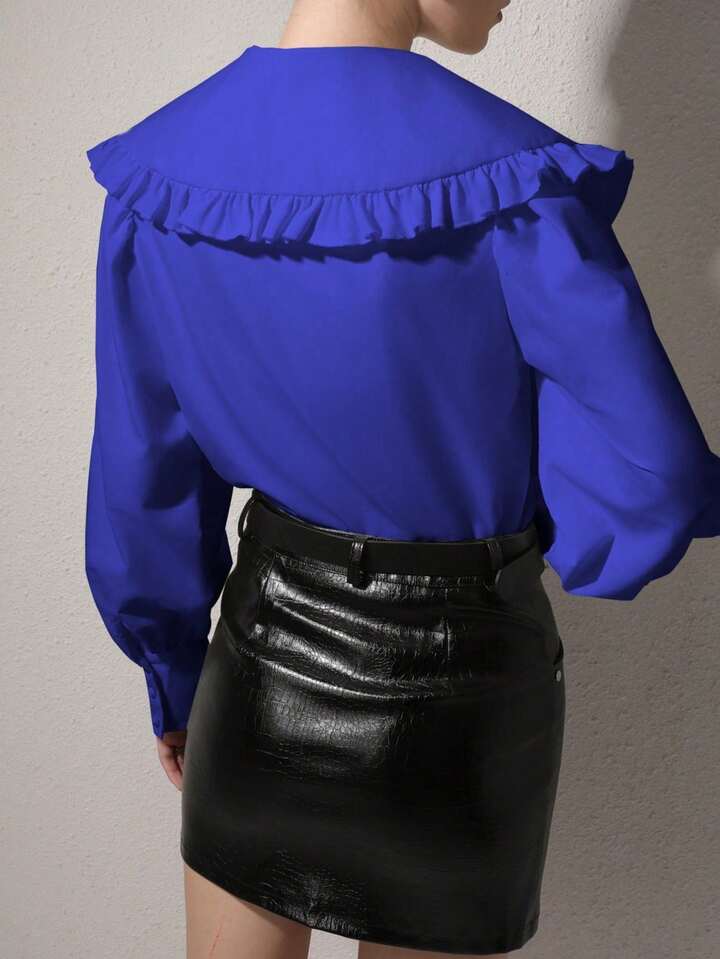 CM-TS278792 Women Elegant Seoul Style Solid Color Peter Pan Collar Bishop Sleeve Ruffle Detail Long Sleeve Blouse