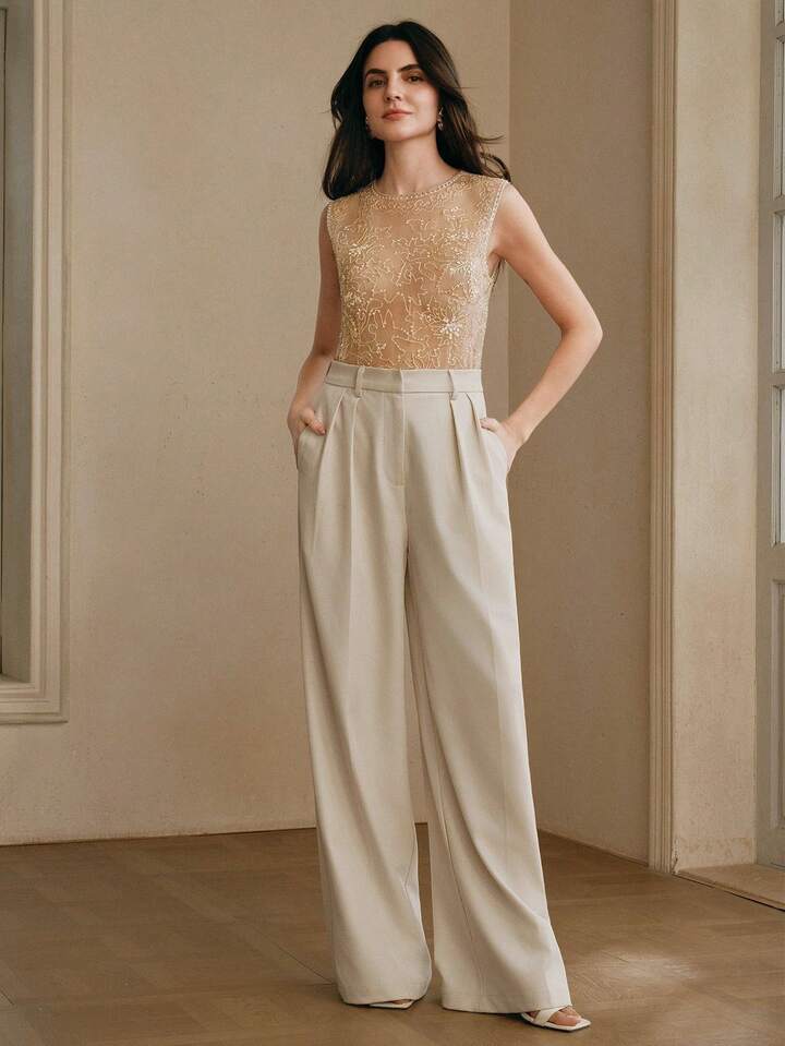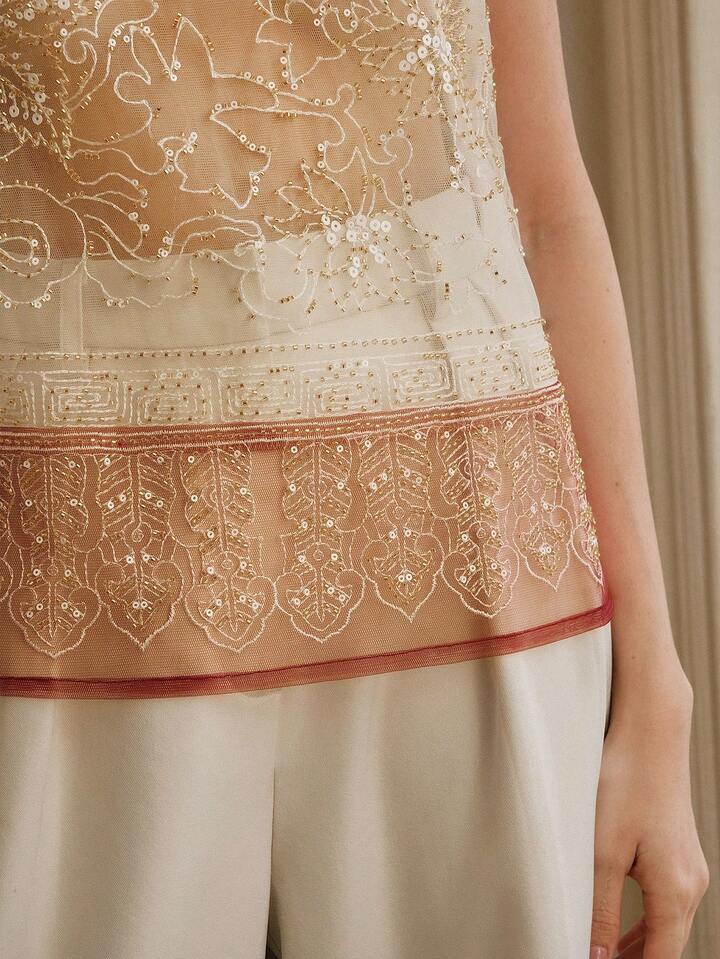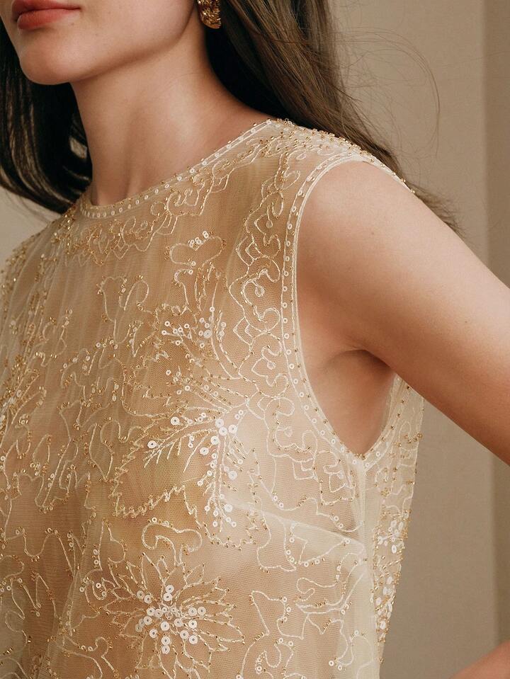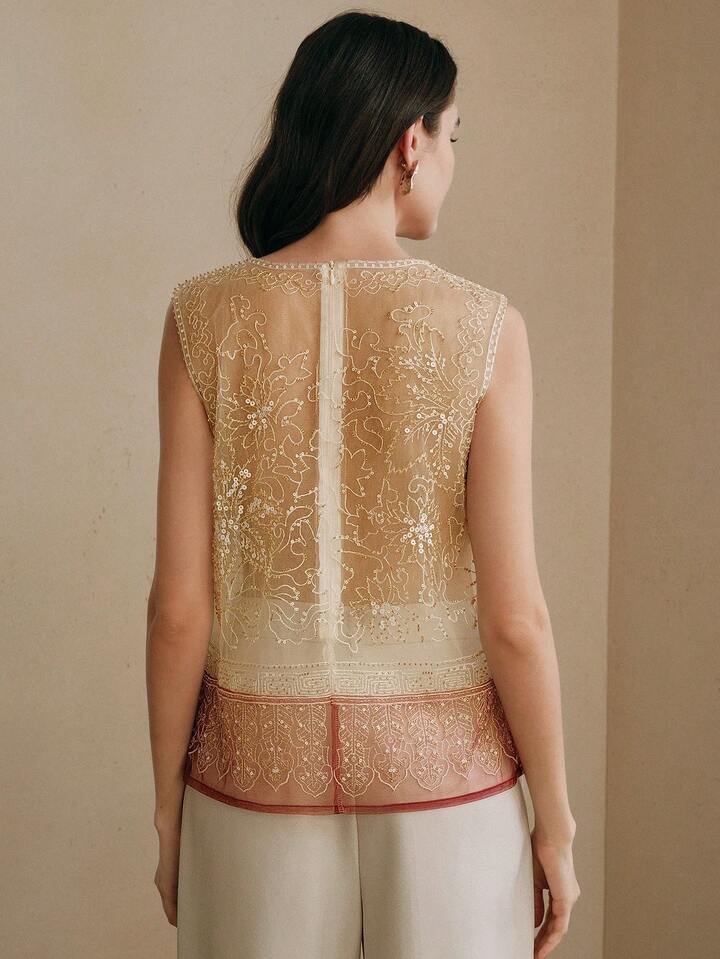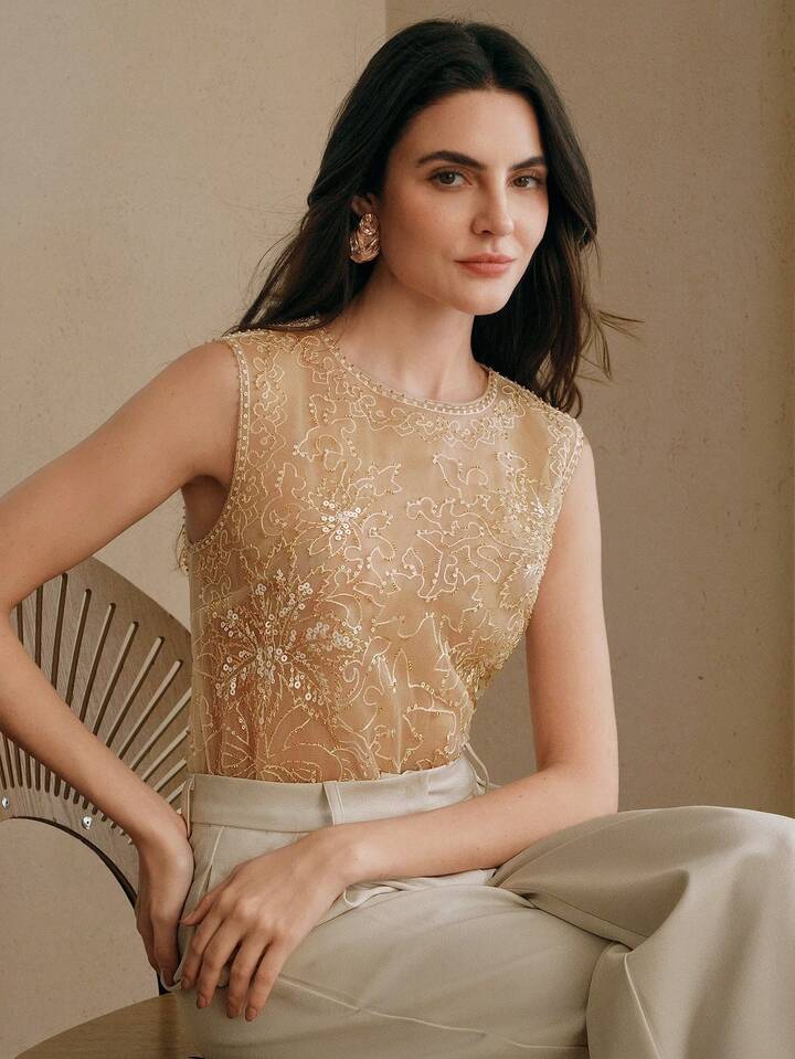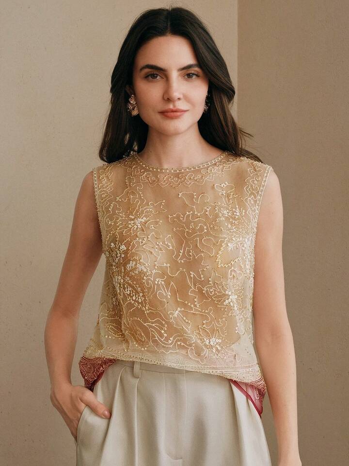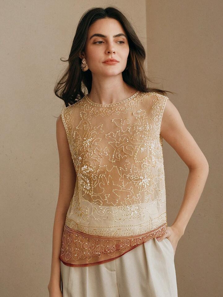 CM-TS283322 Women Elegant Seoul Style Round Neck Sleeveless Beaded Mesh Contrast Color Tank Top