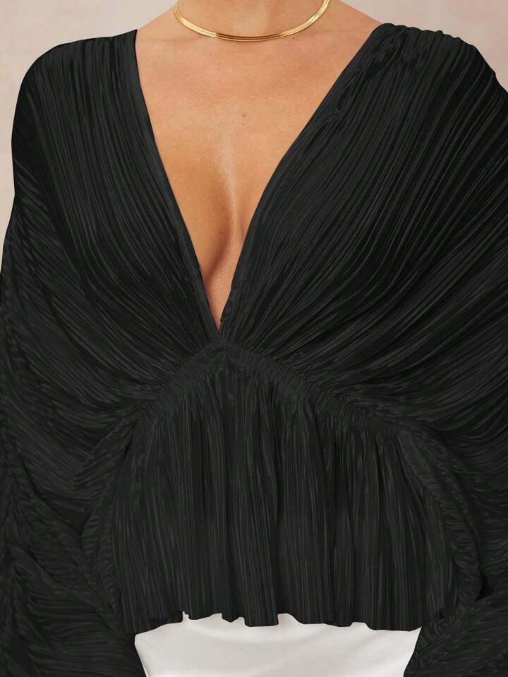 CM-TS291833 Women Elegant Seoul Style Deep V-Neck Long Sleeve Loose Fit Ruffled Hem Oversized Blouse - Black