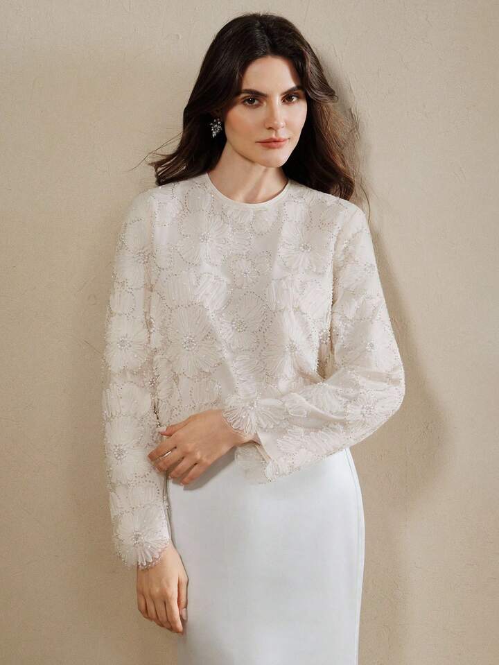 CM-TS303207 Women Elegant Seoul Style Round Neck Long Sleeve Floral Beaded Sheer Blouse - Apricot