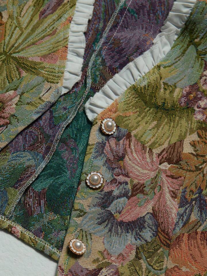 CM-TS413203 Women Casual Seoul Style Jacquard Patchwork Faux Tencel Contrast Collar Ruffle Bubble Long Sleeve Blouse