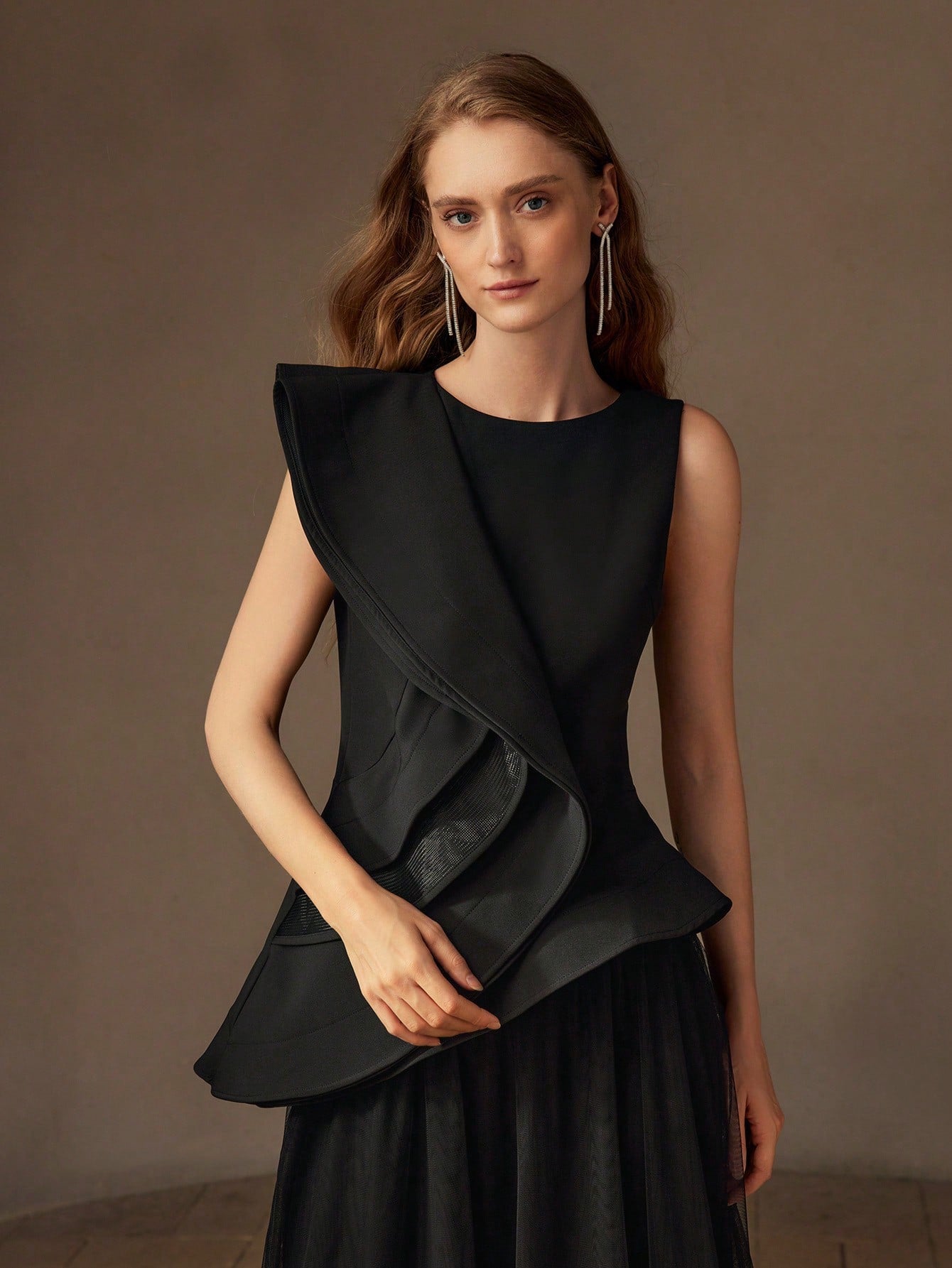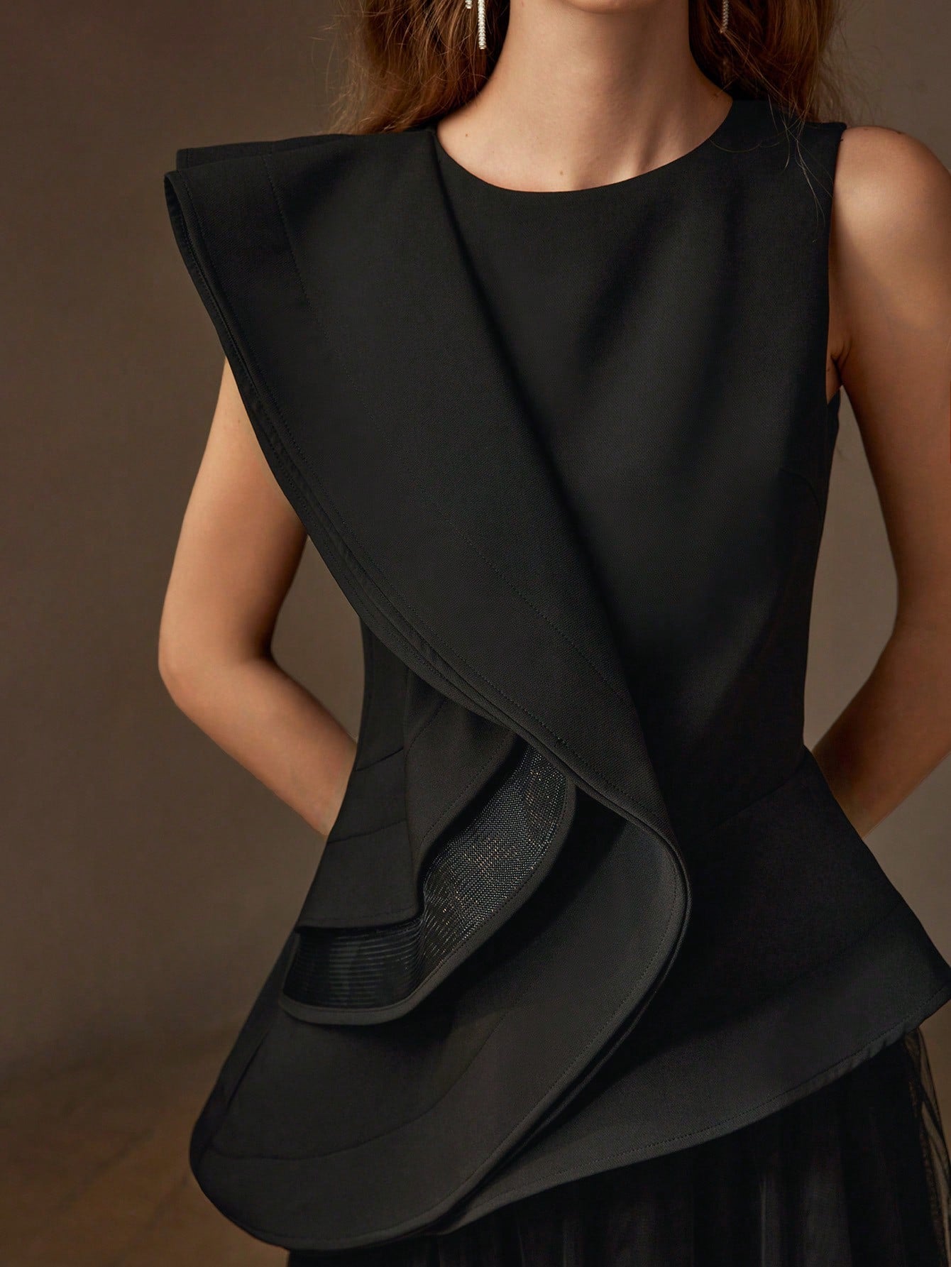 CM-TS446936 Women Elegant Seoul Style Solid Layered Ruffle Trim Asymmetrical Hem Peplum Top - Black