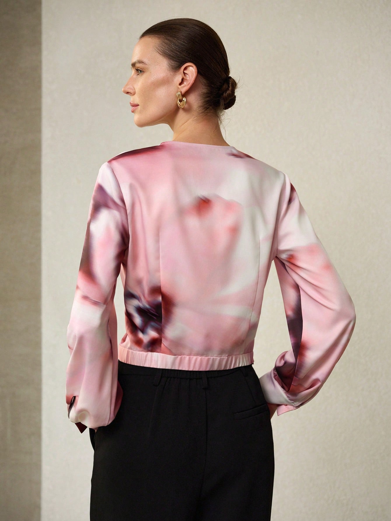 CM-TS477941 Women Elegant Seoul Style V-Neck Ruched Lantern Sleeve Printed Tight Hem Top