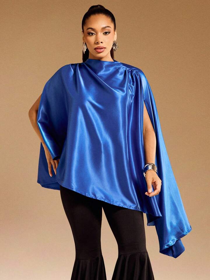 CM-TS529165 Women Elegant Seoul Style Stand Collar Satin Draped Asymmetrical Hem Cape Top - Blue