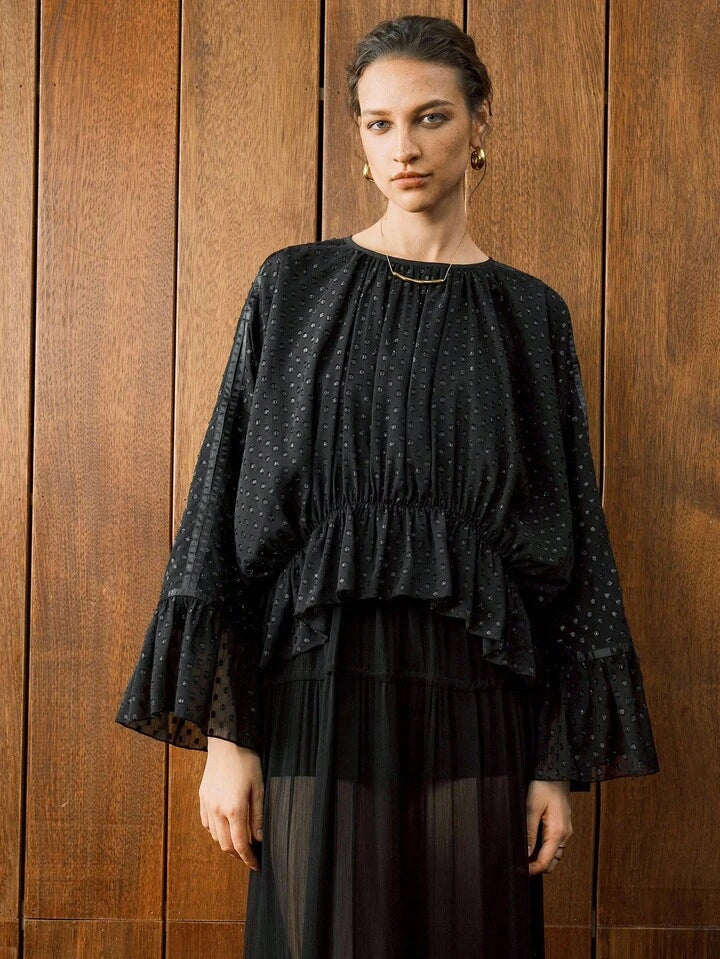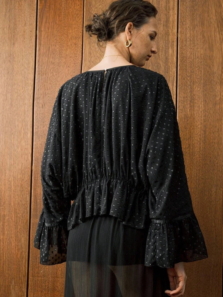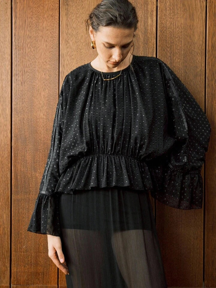CM-TS538131 Women Elegant Seoul Style Polka Dot Chiffon Jacquard Drop Shoulder Waist Ruffle Design Hem Blouse