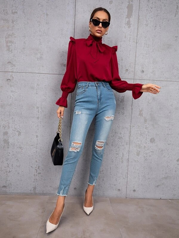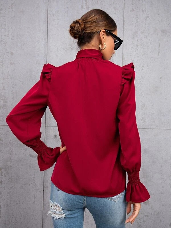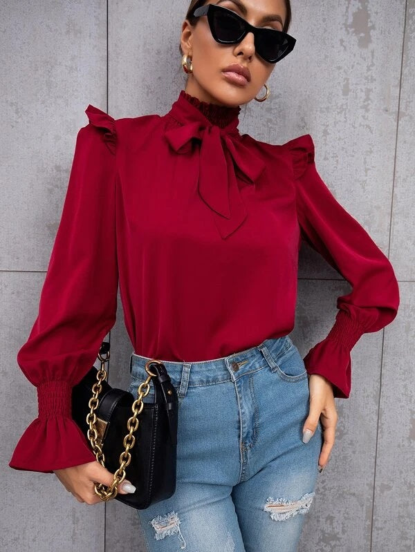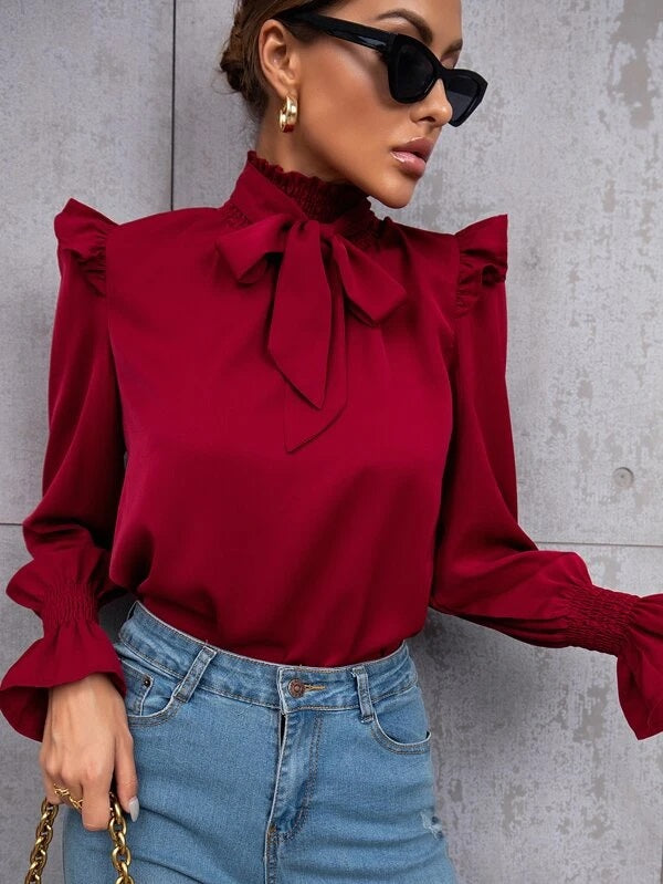 CM-TS539081 Women Casual Seoul Style Shirred Flounce Sleeve Frilled Tie Neck Blouse