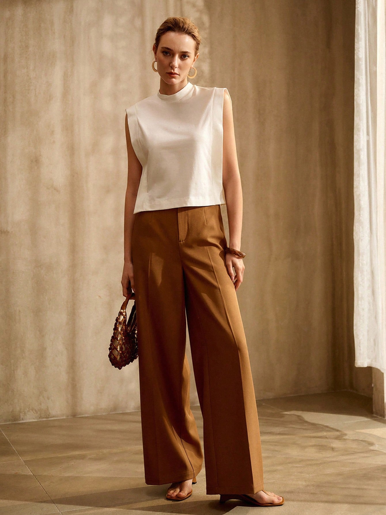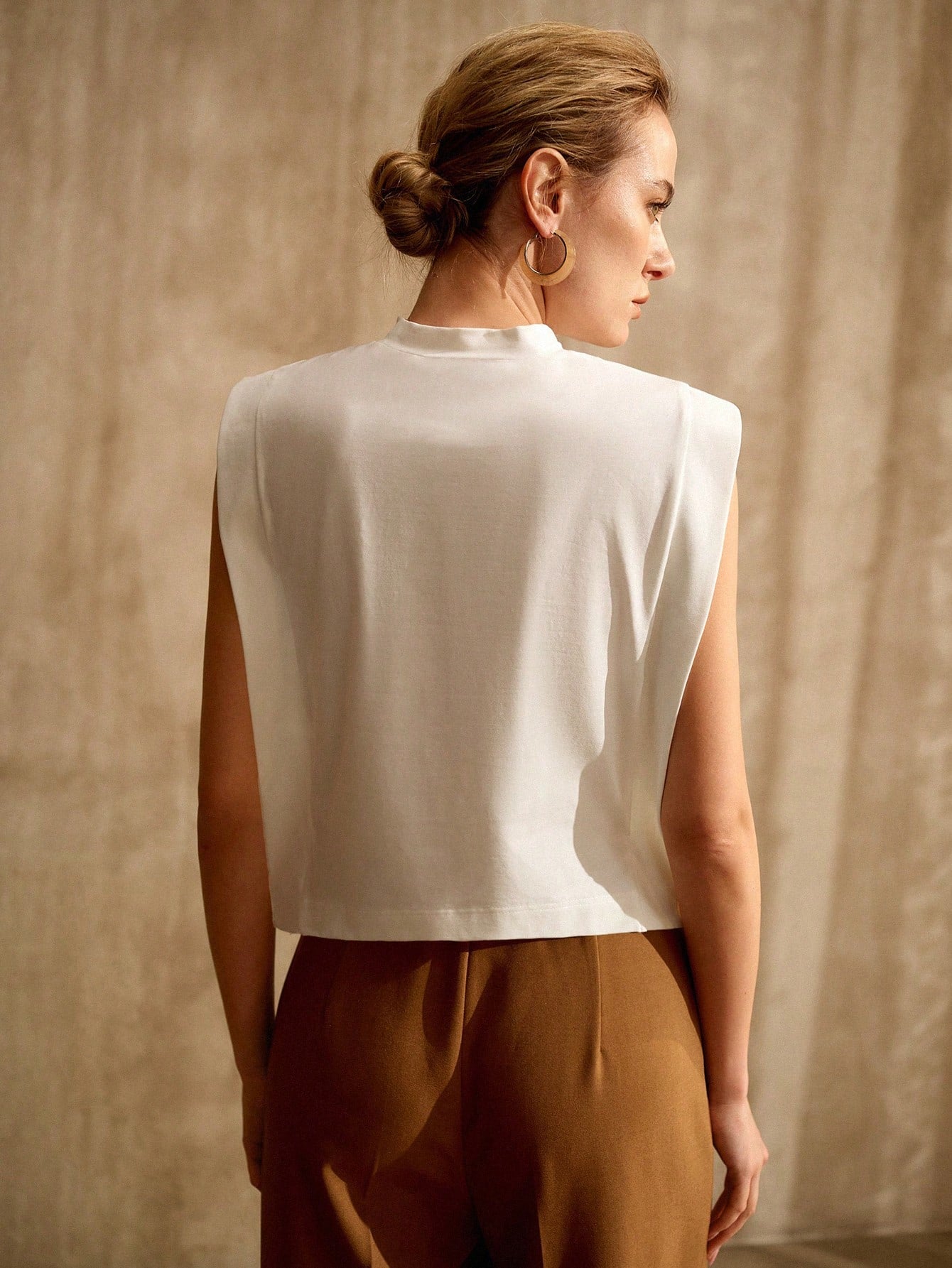 CM-TS545034 Women Elegant European Style Stand Collar Sleeveless Knit Tank Top - White