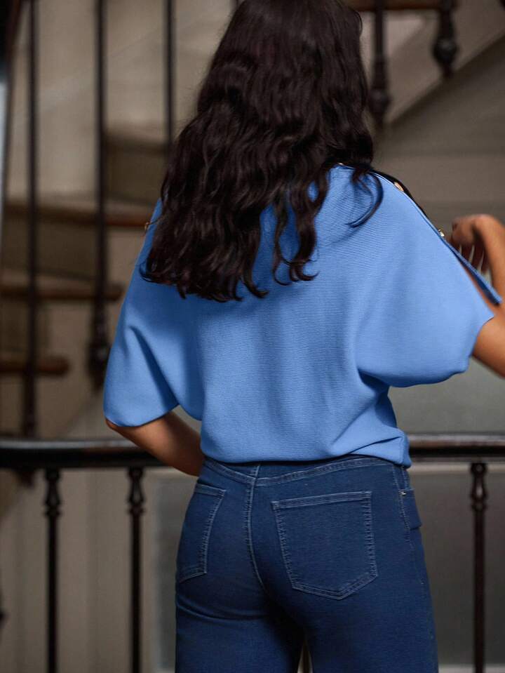 CM-TS545315 Women Casual Seoul Style Short Sleeve Knit Kimono-Style Loose Fit Top With Gold Button Shoulder Detail