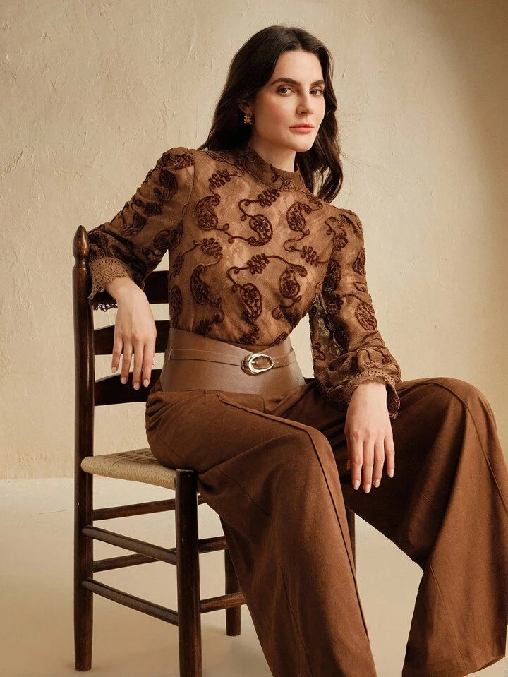 CM-TS672535 Women Elegant Seoul Style Pumpkin Printed Velvet Lace Round Neck Lantern Sleeve Blouse