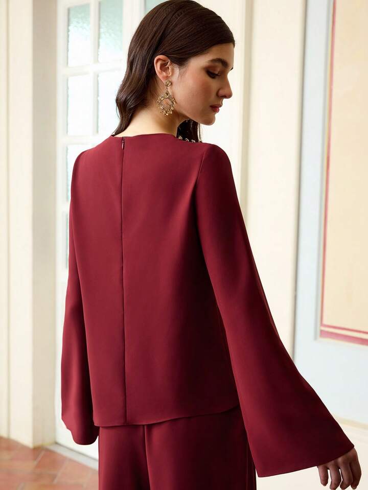 CM-TS713366 Women Elegant Seoul Style Pearl Decor Button Round Neck Long Sleeve Blouse - Burgundy