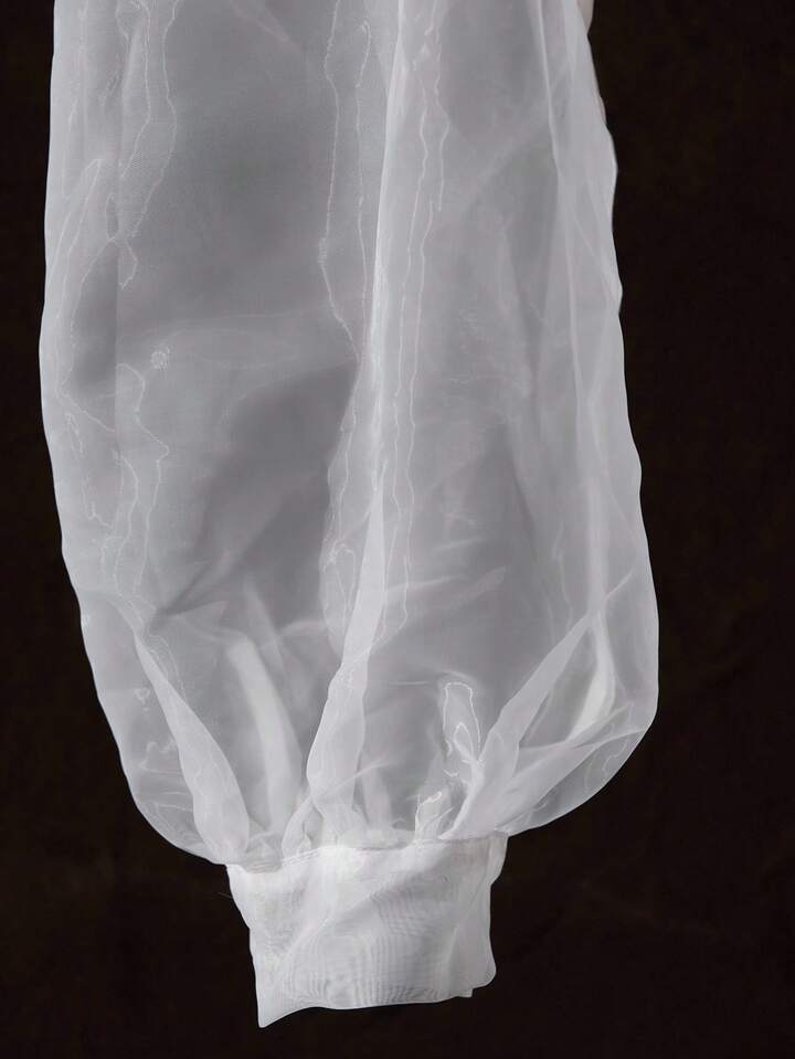 CM-TS713635 Women Elegant Seoul Style Tie Neck Puff Sleeve Organza Sheer Bowknot Blouse - White