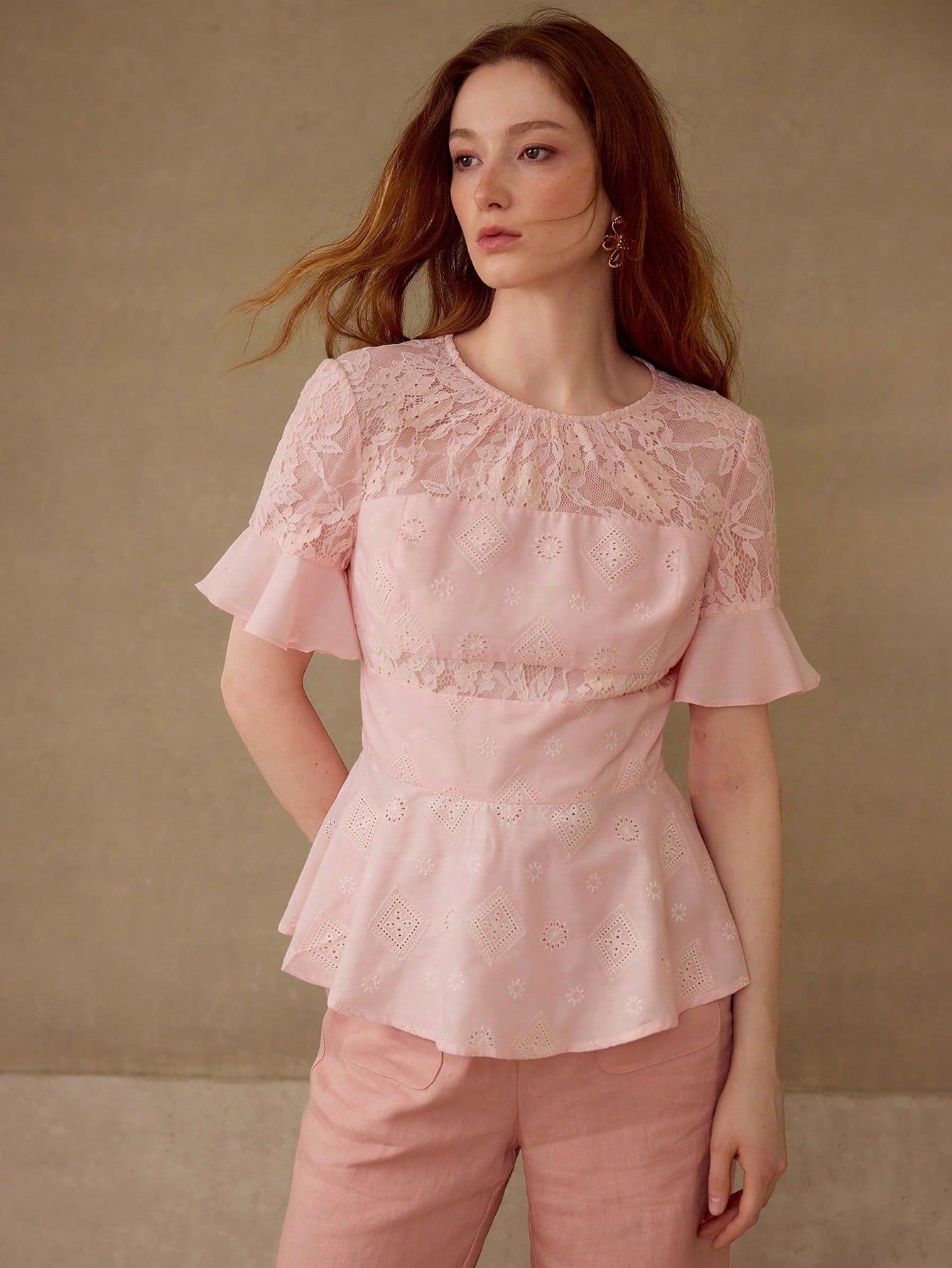 CM-TS838176 Women Elegant Seoul Style Round Neck Short Sleeve Contrast Lace Peplum Top - Pink