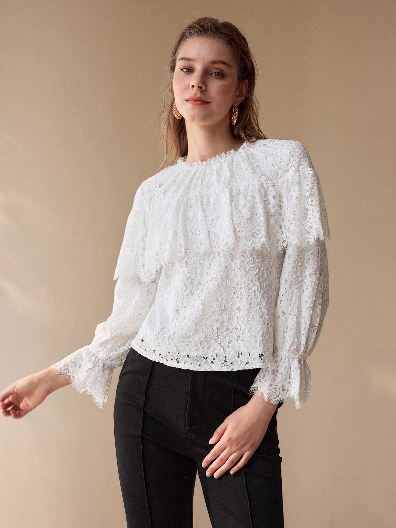 CM-TS840828 Women Elegant Seoul Style Round Neck Long Sleeve Lace Ruffle Trim Blouse - White