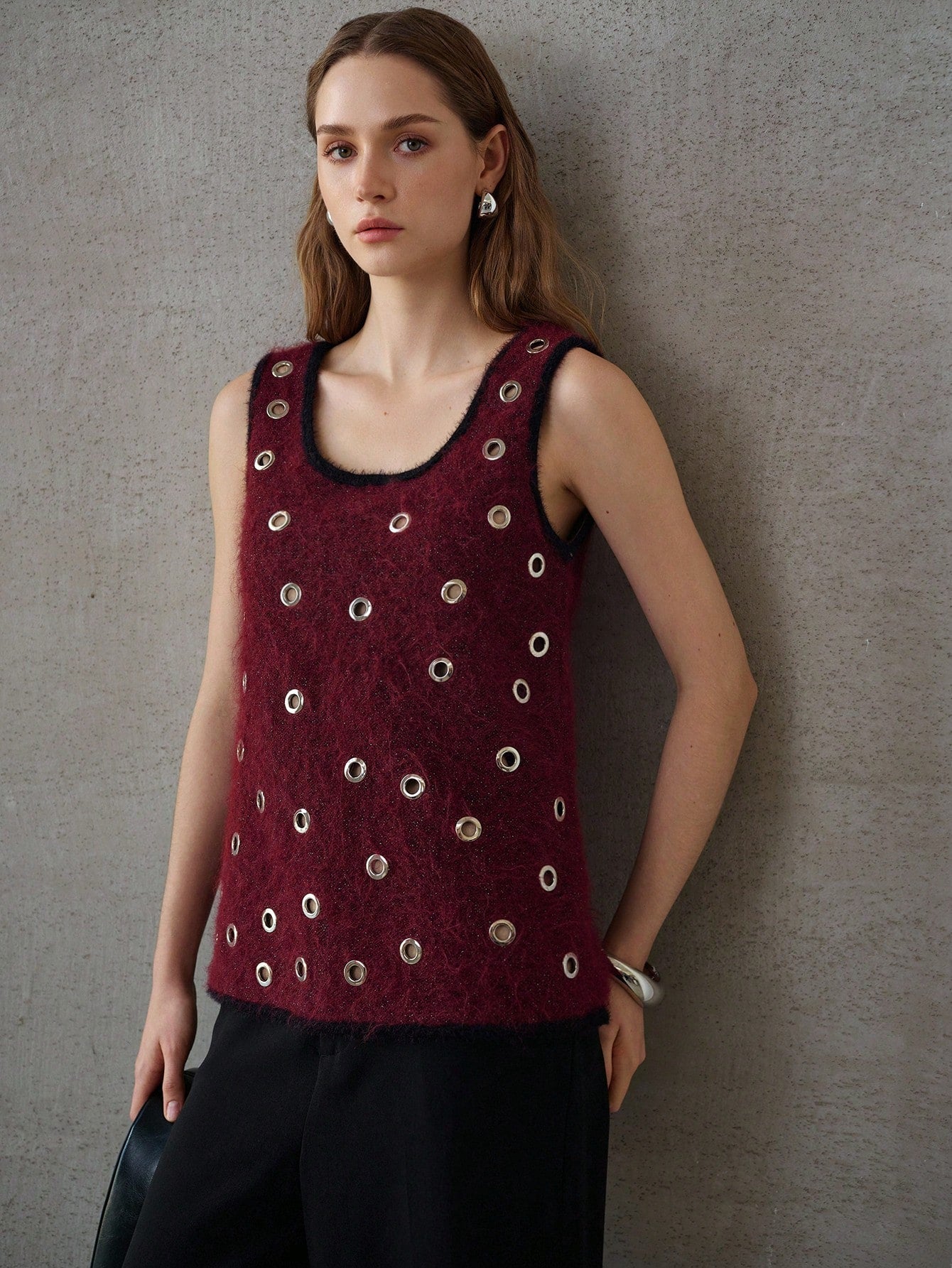 CM-TS841381 Women Elegant Seoul Style Scoop Neck Sleeveless Eyelet Tank Top - Burgundy